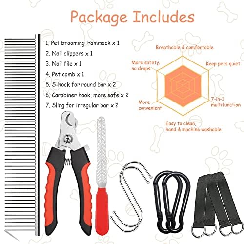🎄【Pet Grooming HammocK Kit】: Cat/Dog Grooming Hammock x 1, Nail Clippers x 1, Nail File x 1, Steel Pet Comb x 1, S-hook x 2,Carabiner x 2 , Dog Grooming Sling x2 .Safety harness and safety Carabiner, perfectly adapted to different hanging poles, sturdy material to protect your pet from dropping.