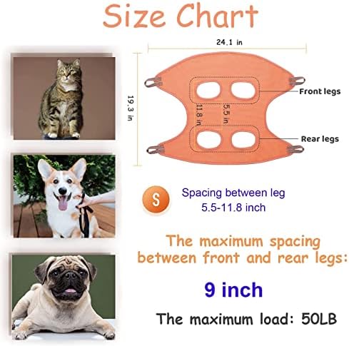 🎄【Size】This pet hammock carrier size S fits small dogs and cats with front and rear leg spacing of 5.5-11.8 inches and weighing 10-25 lbs. Size L fits medium to large dogs with front and rear leg spacing of 7.1-13.8 inches and weighing 35-60 lbs. Please read the size chart and measure your pet’s front and back leg spacing before purchasing to get a more suitable product size.